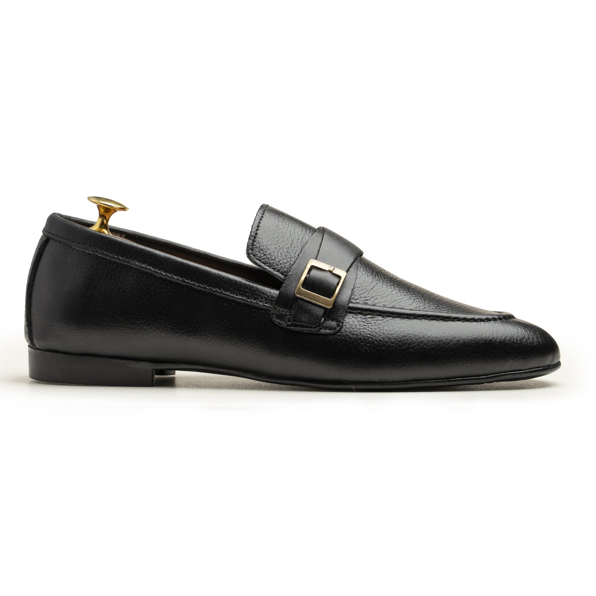 Make a statement of refined elegance with the SAMAS Leather Black Buckle Dress Shoes - a modern interpretation of classic sophistication. Expertly handcrafted from premium full-grain leather, these shoes feature a distinctive pebble-grain texture and a bold antique-finish buckle detail that adds a contemporary touch to their timeless silhouette.